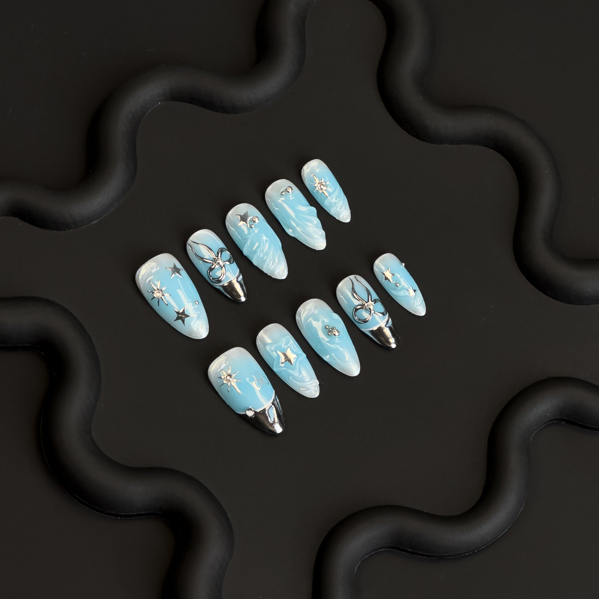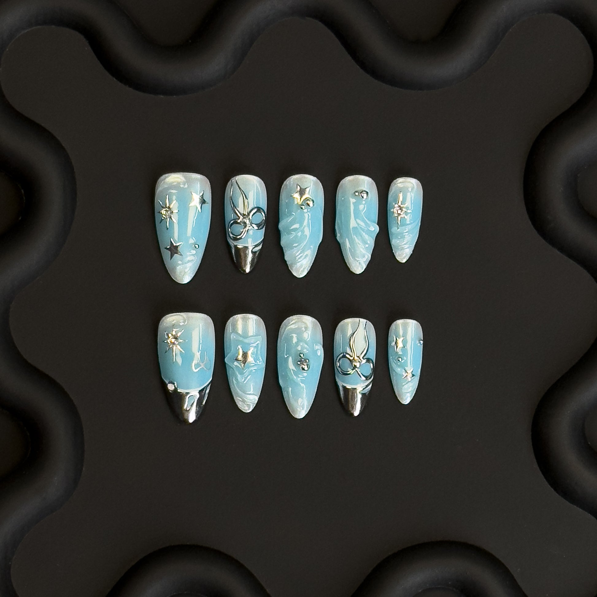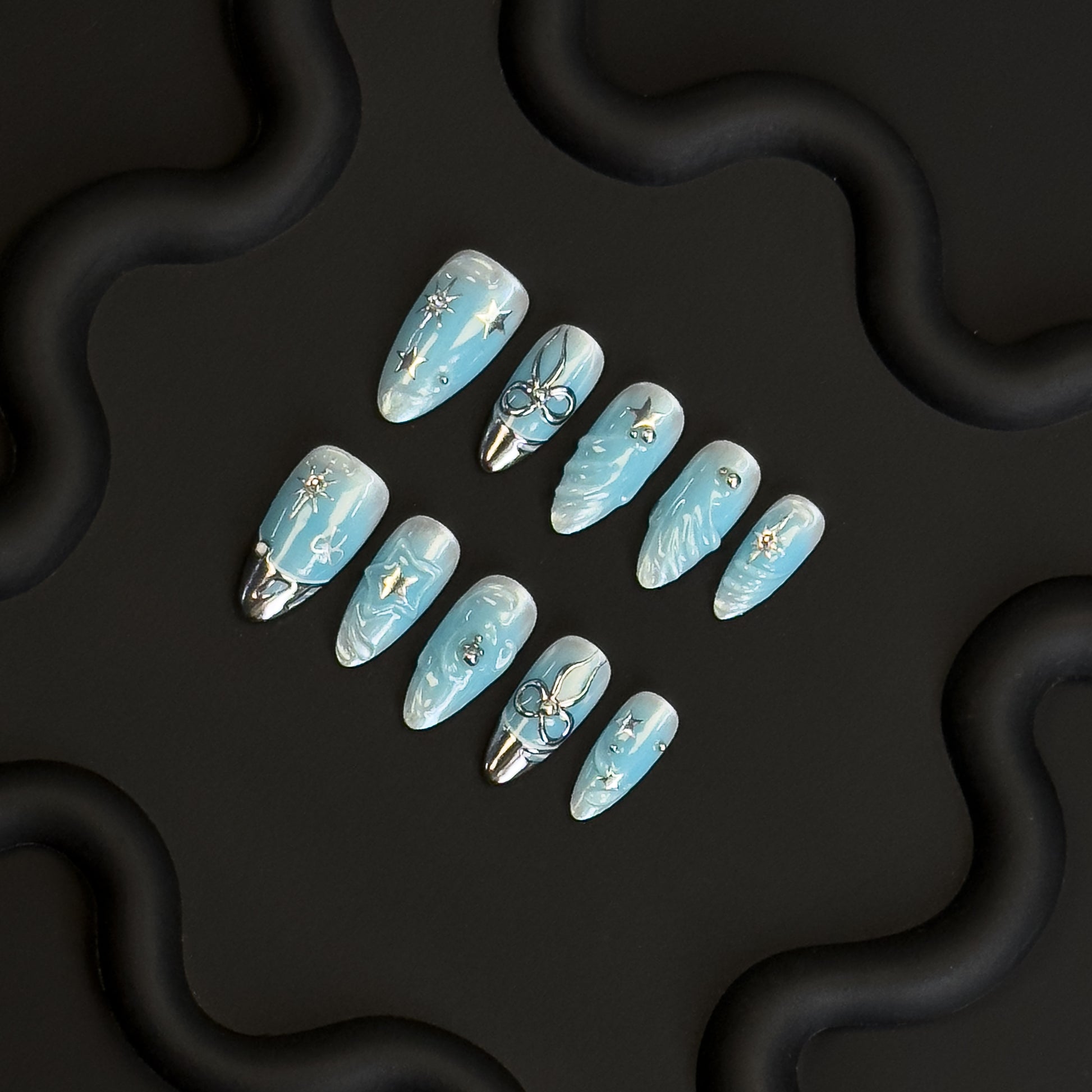 a deep sky-blue set, adorned with shimmering stars, metallic accents, and sculpted wave details. Inspired by the vast night sky and endless ocean, this set brings a celestial glow to your fingertips.