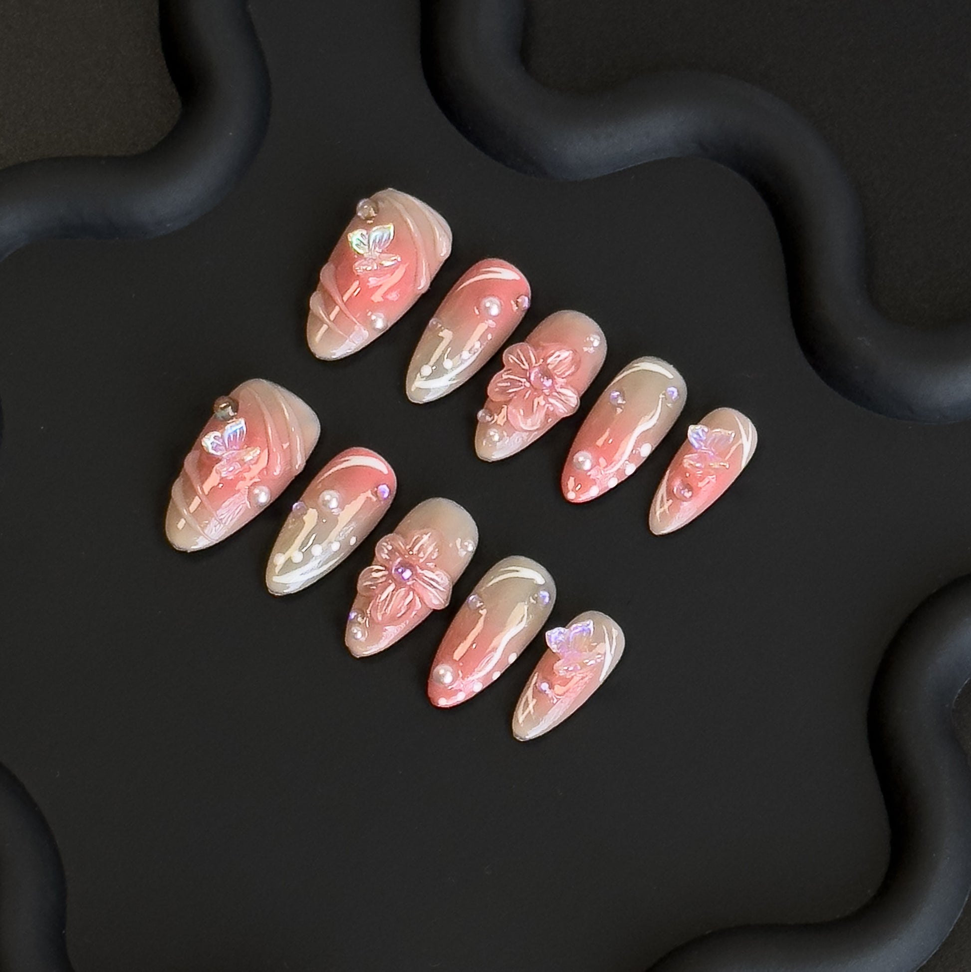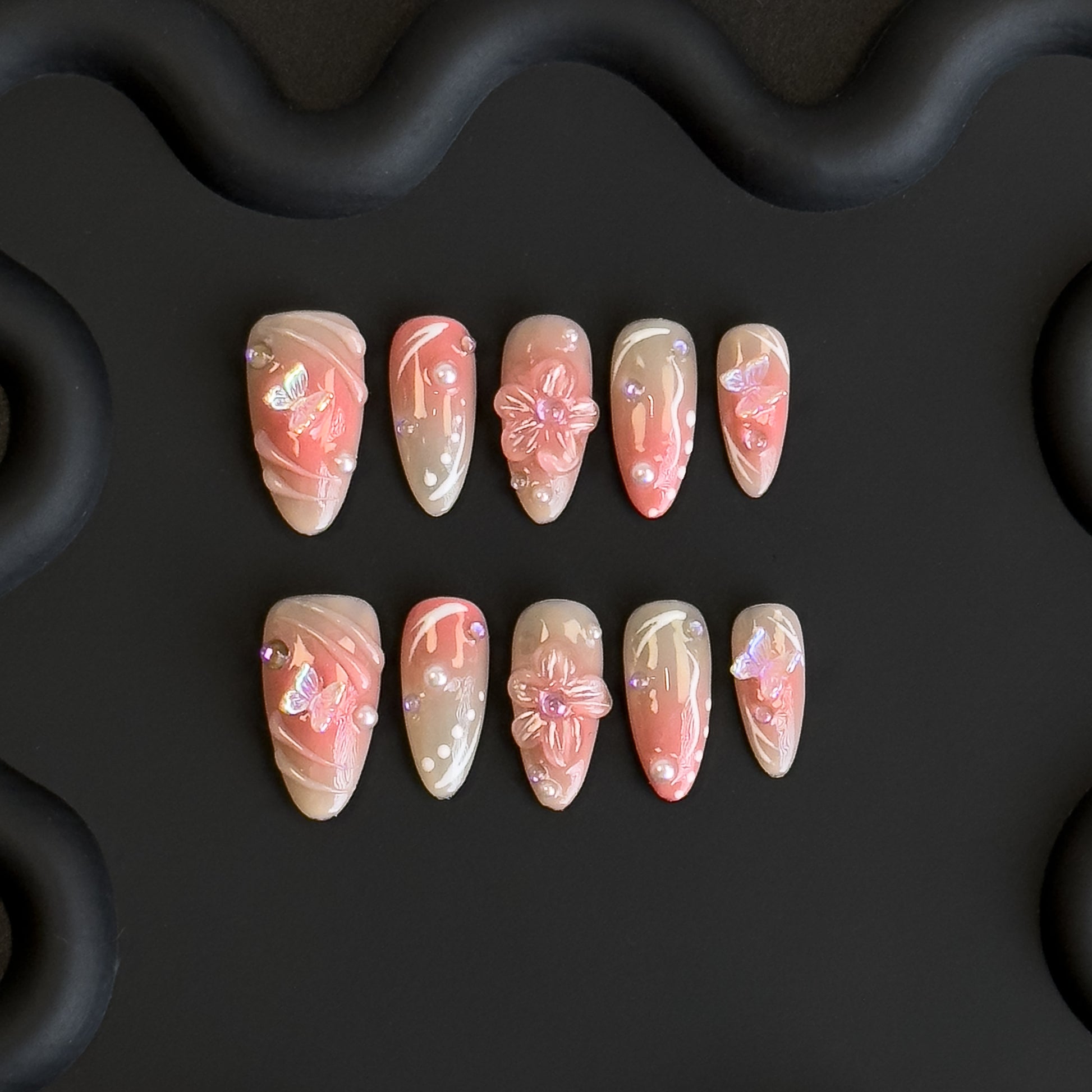 a soft nude and coral gradient, adorned with 3D floral accents, delicate butterflies, and shimmering gems. Light, airy, and effortlessly elegant, this set brings a whimsical charm to your fingertips.