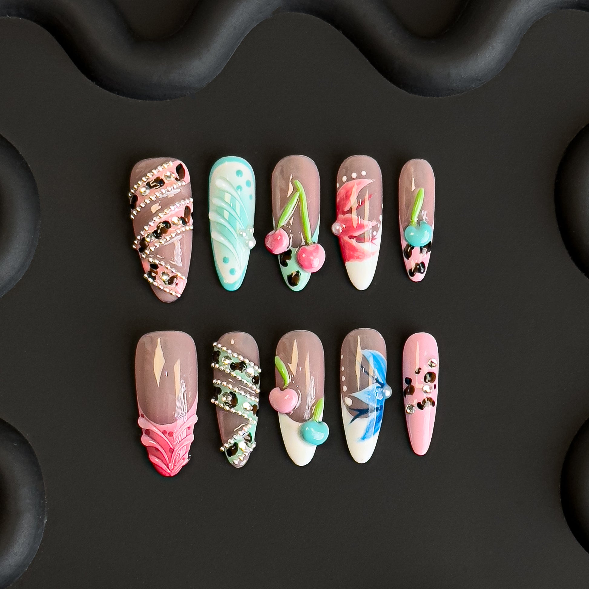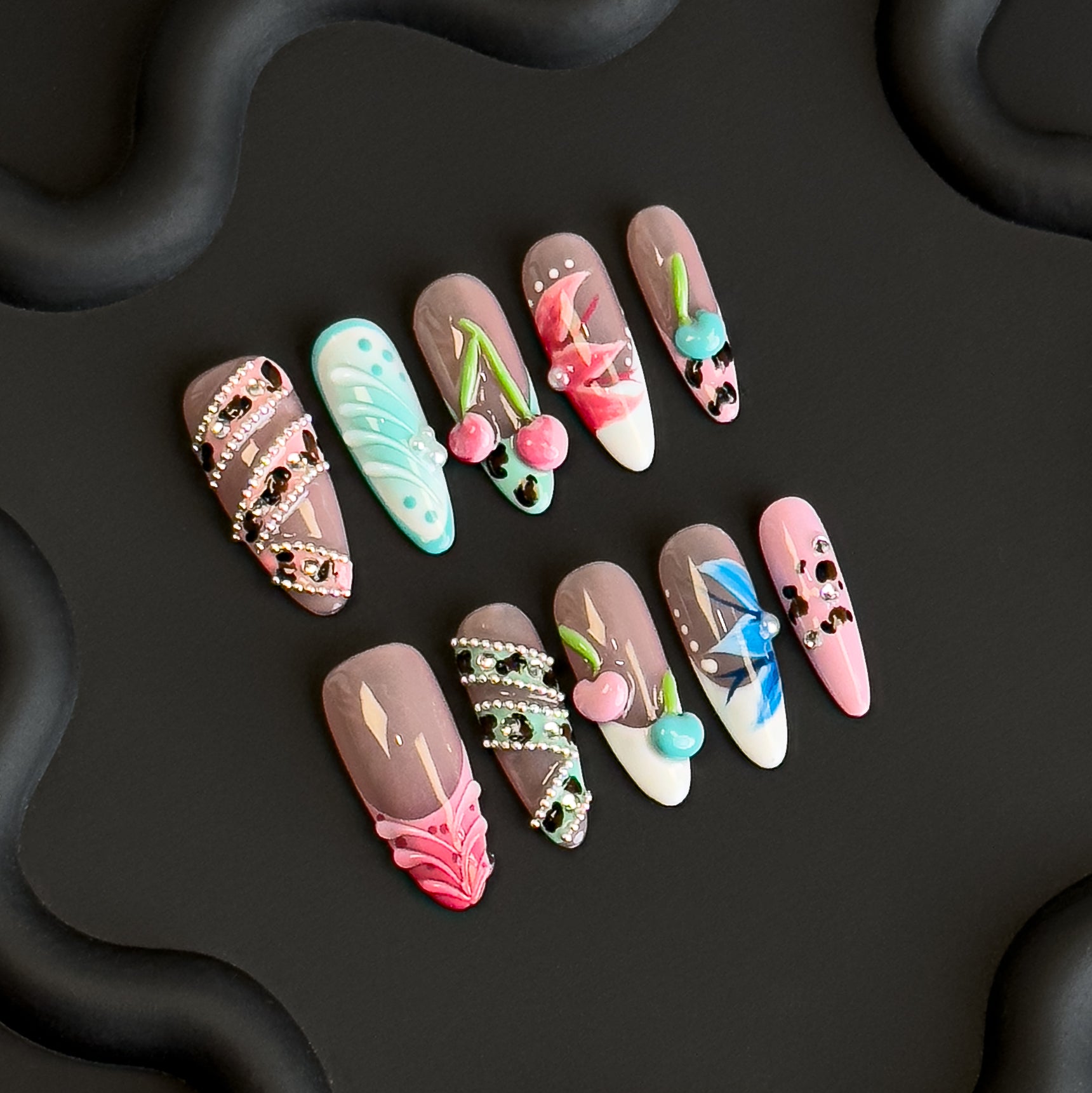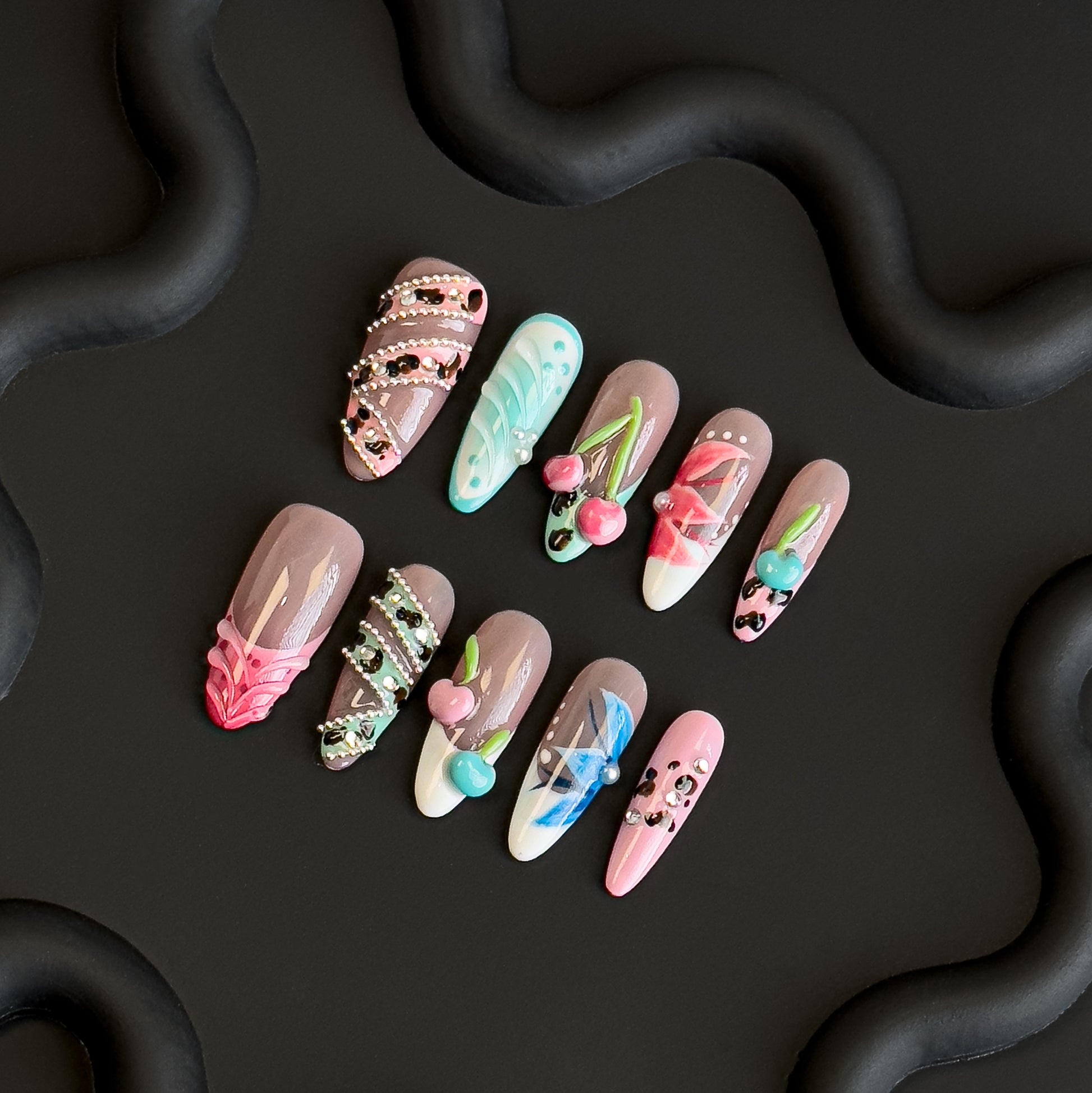 a light pink and mint French design, adorned with 3D cherries and hand-painted florals for a sweet, romantic touch. Glossy accents and vibrant tones add a fresh, luminous charm, perfect for lovers of soft and nature-inspired beauty.