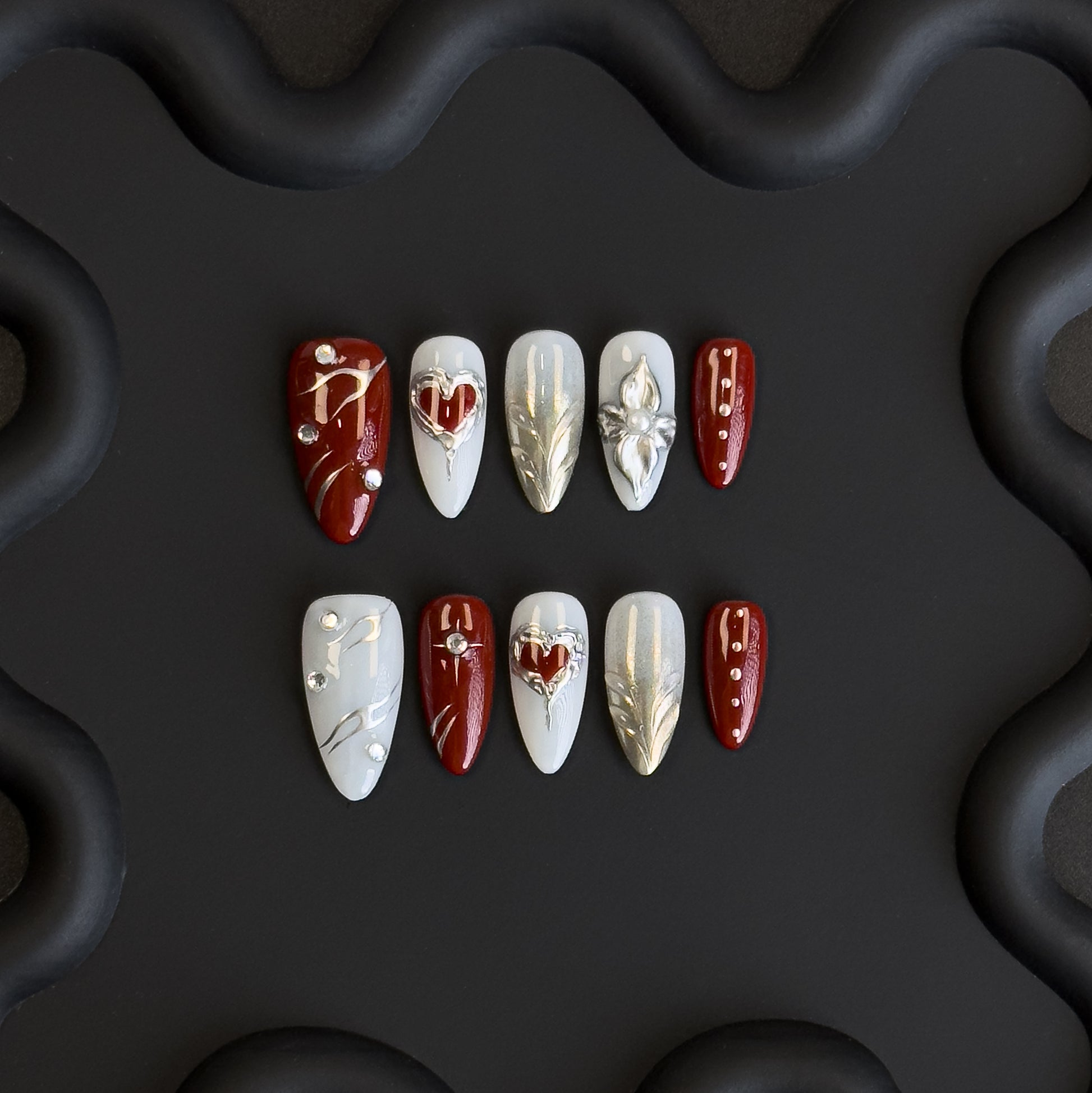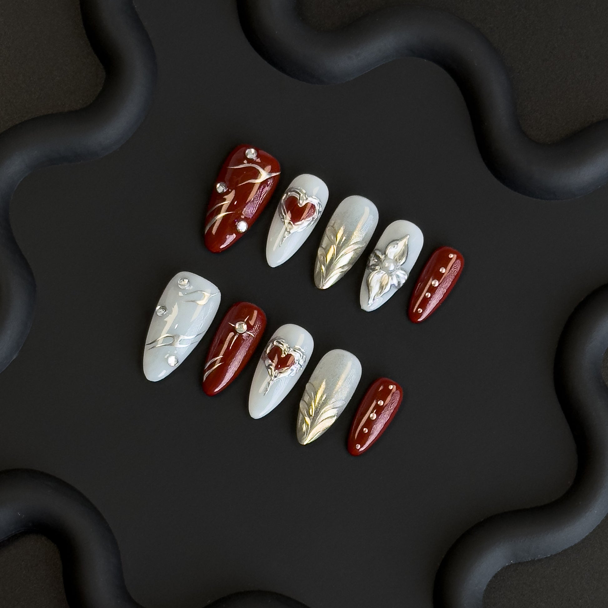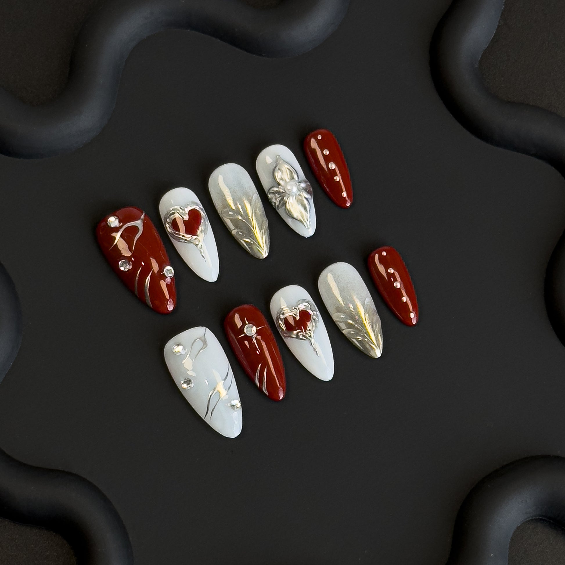 A royal mix of deep red and silver white, decorated with sculpted hearts, metallic feathers, and pearl-like gems. Elegant and bold, this set adds a touch of drama and luxury to any look. Perfect for lovers of vintage glam and statement nails.