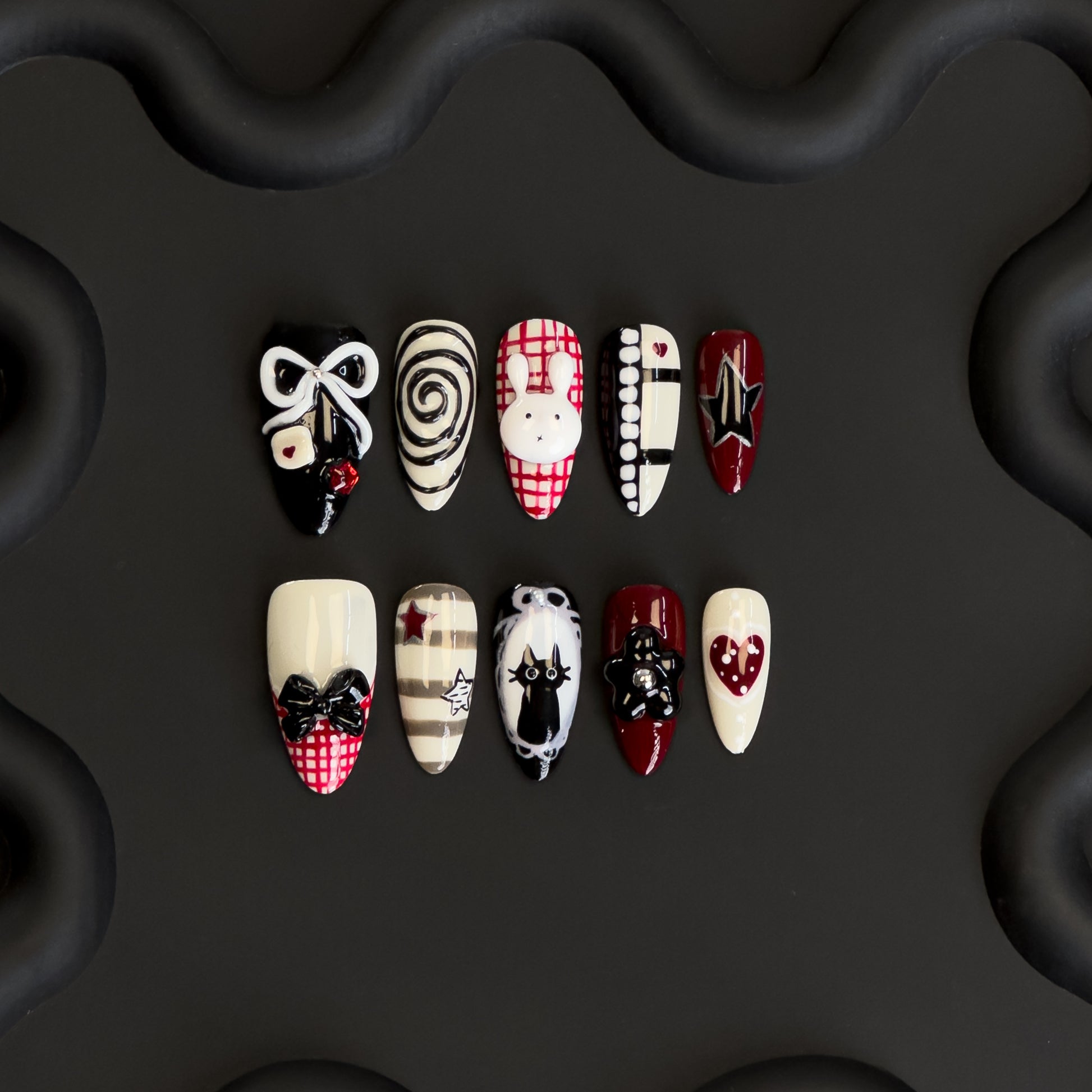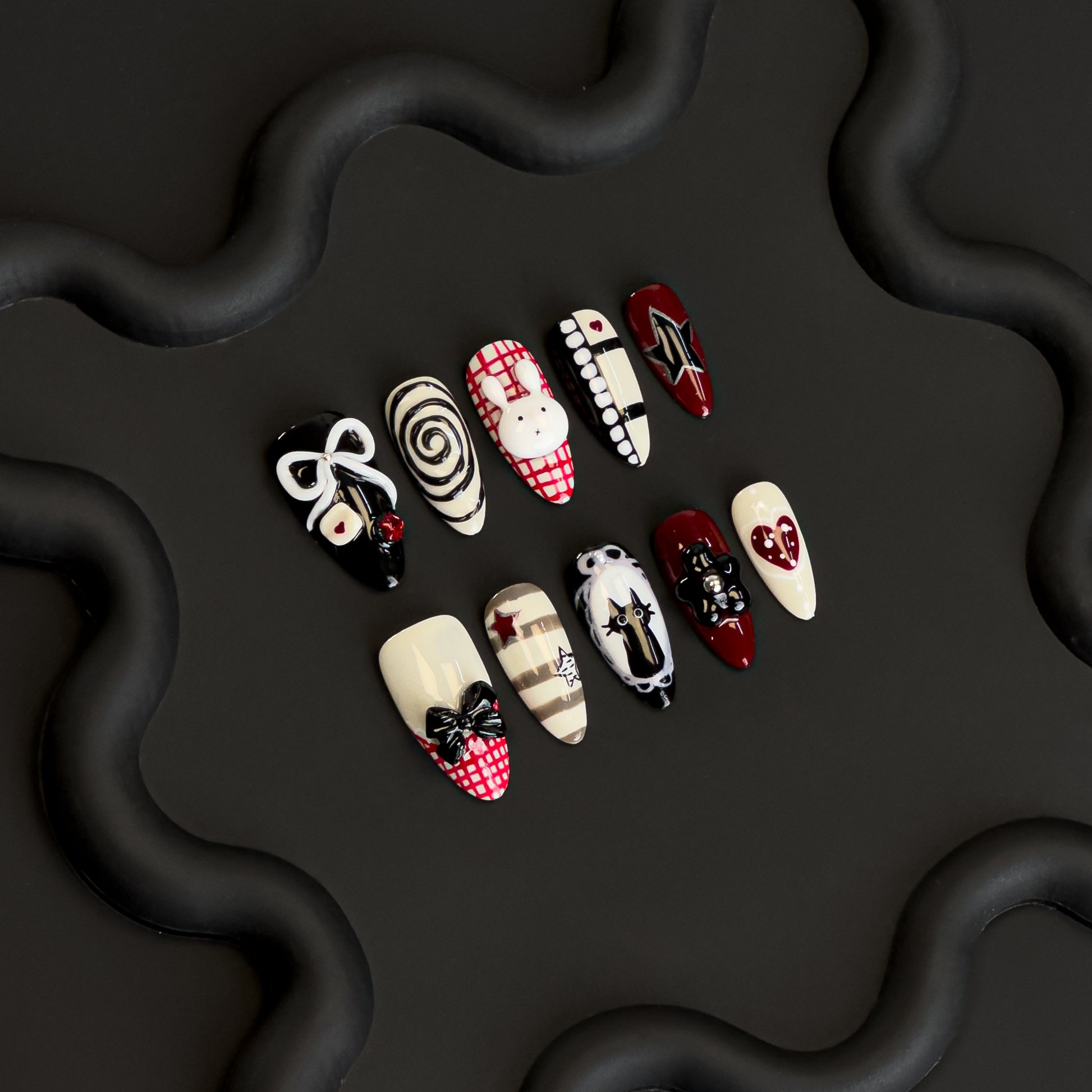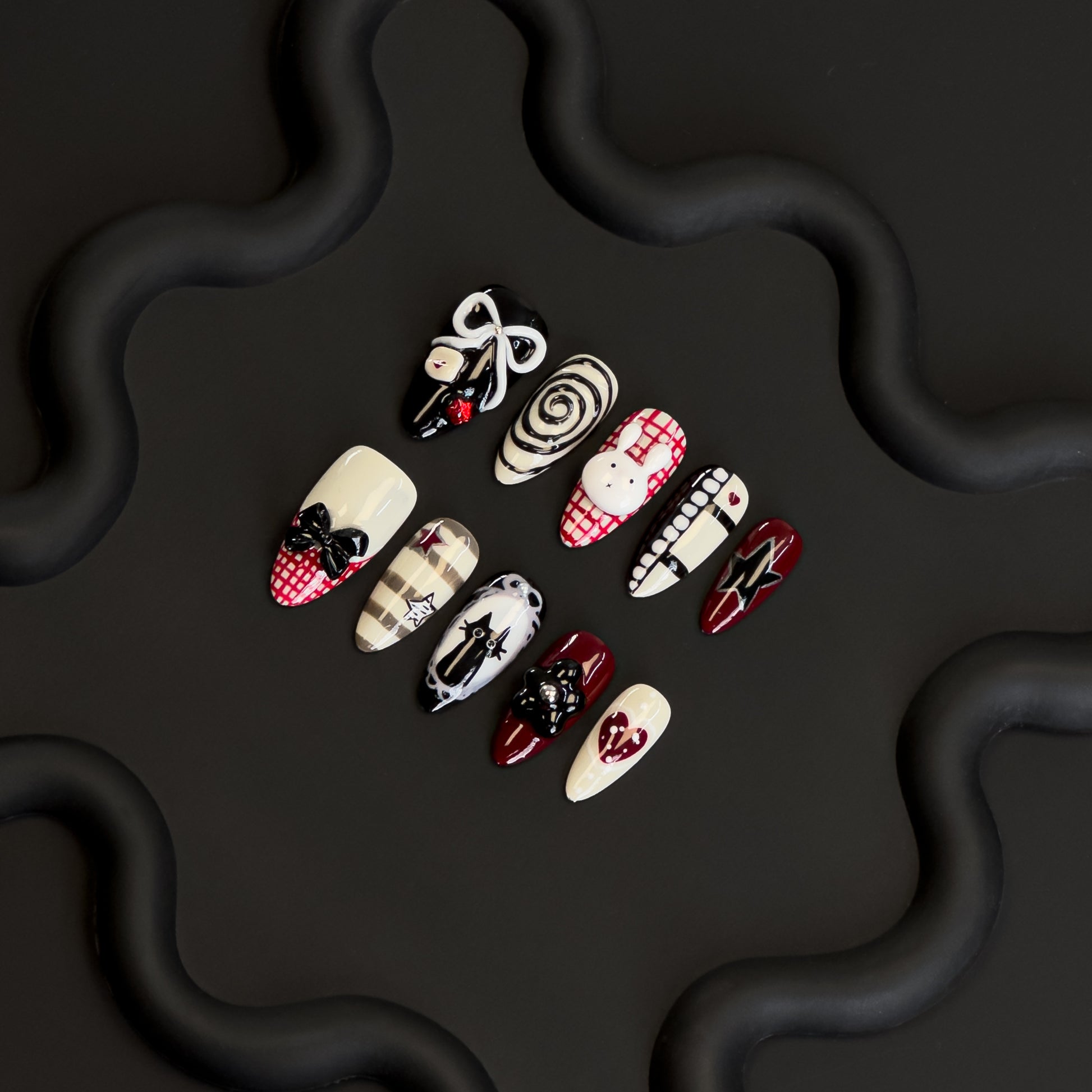 A bold mix of red, black, and cream tones with 3D bows, bunny faces, checker patterns, and spooky-cute details. From spirals to stitched hearts, this set gives off a playful gothic vibe. Perfect for anyone who loves dolls, darkness, and drama.