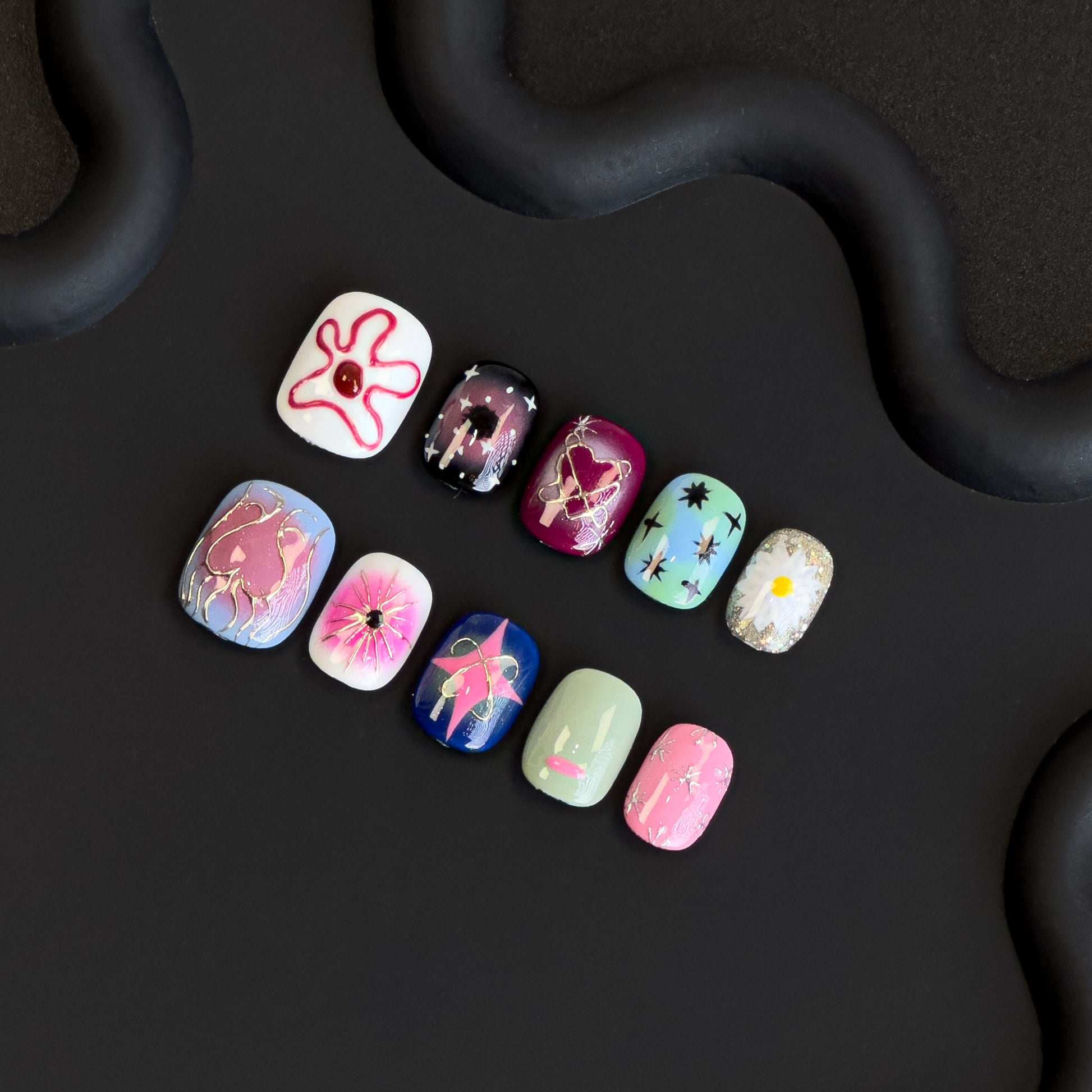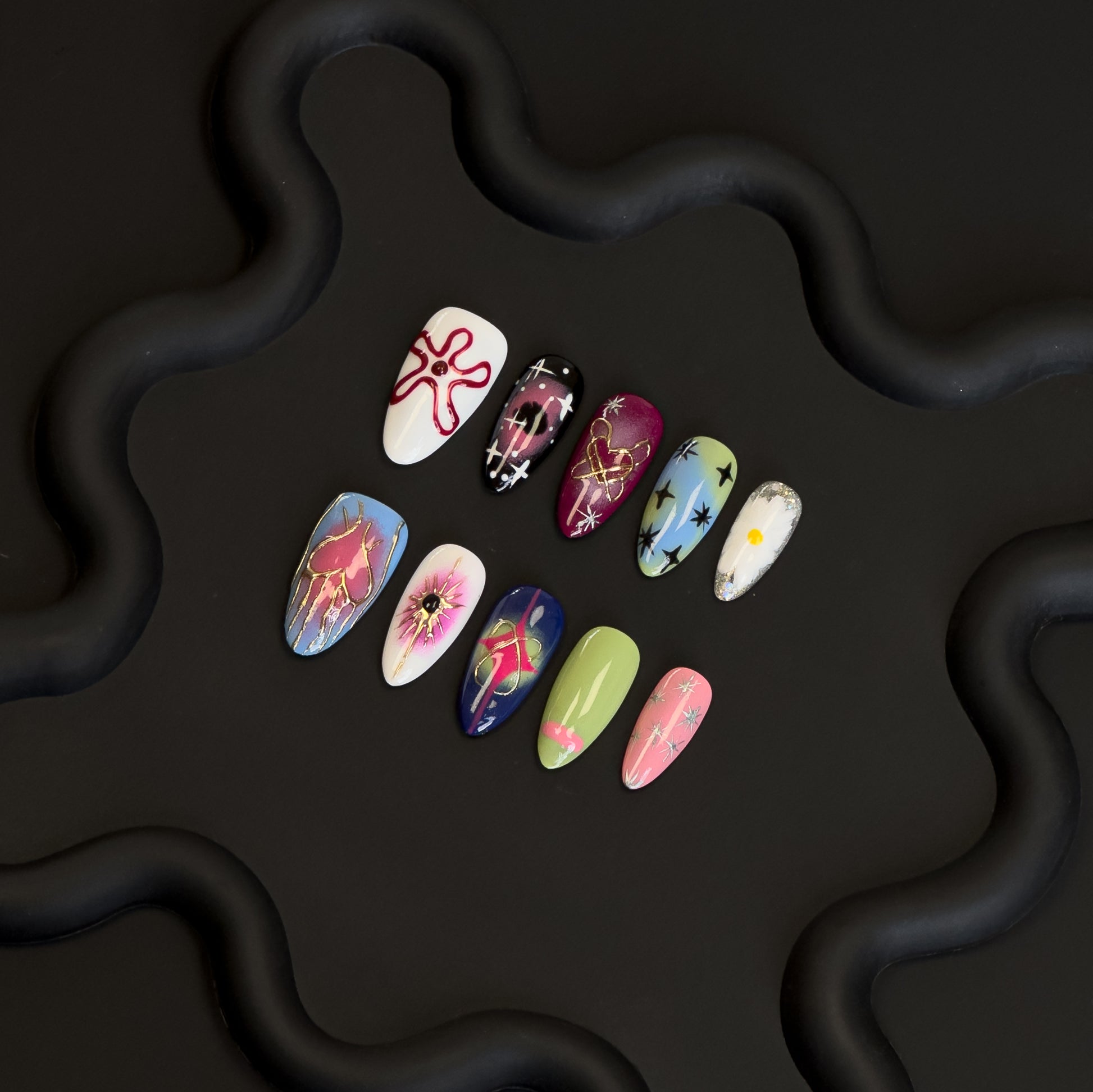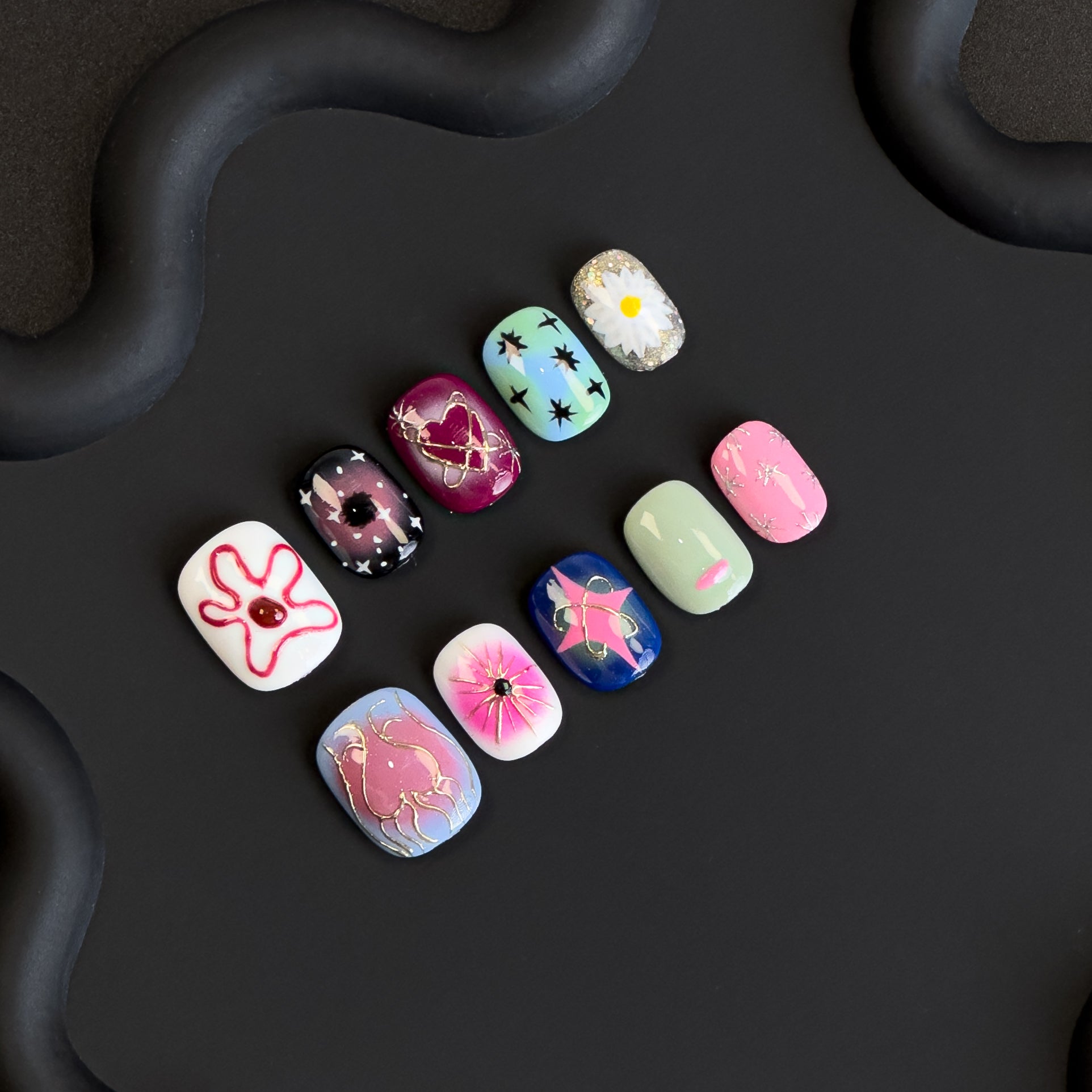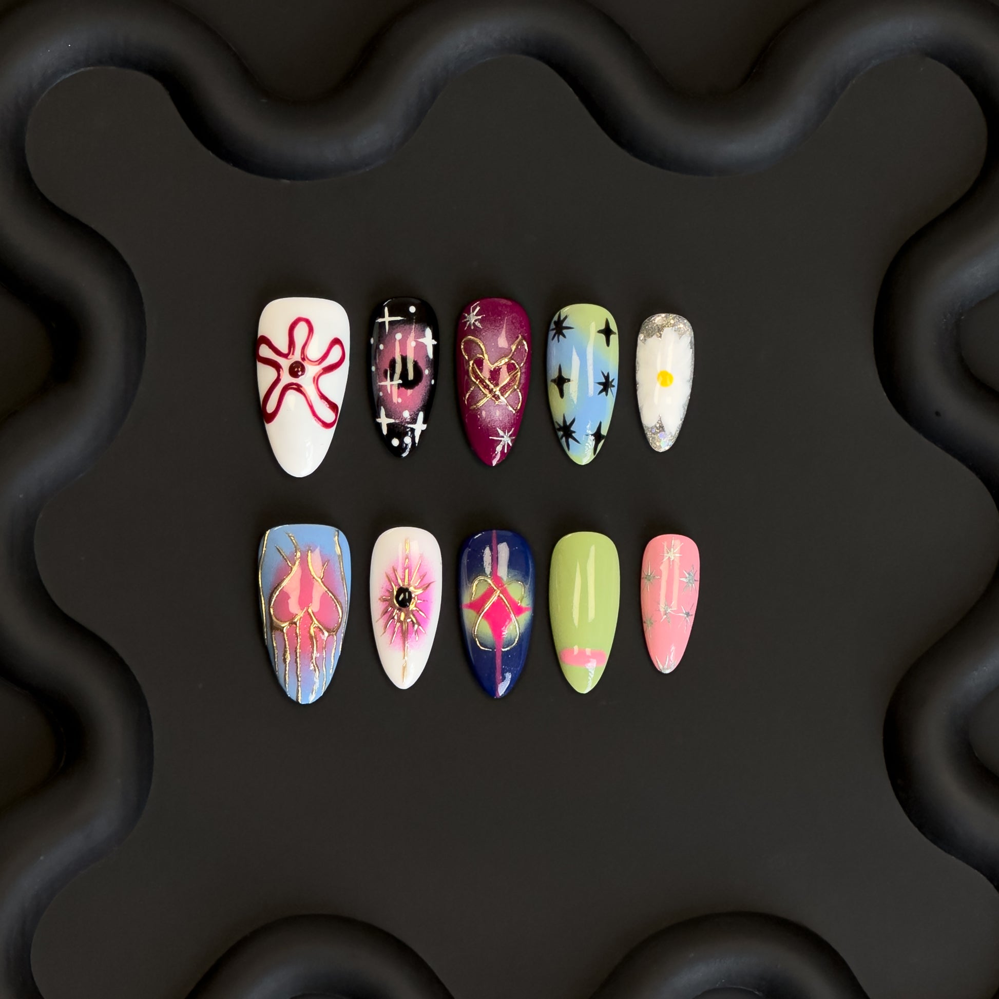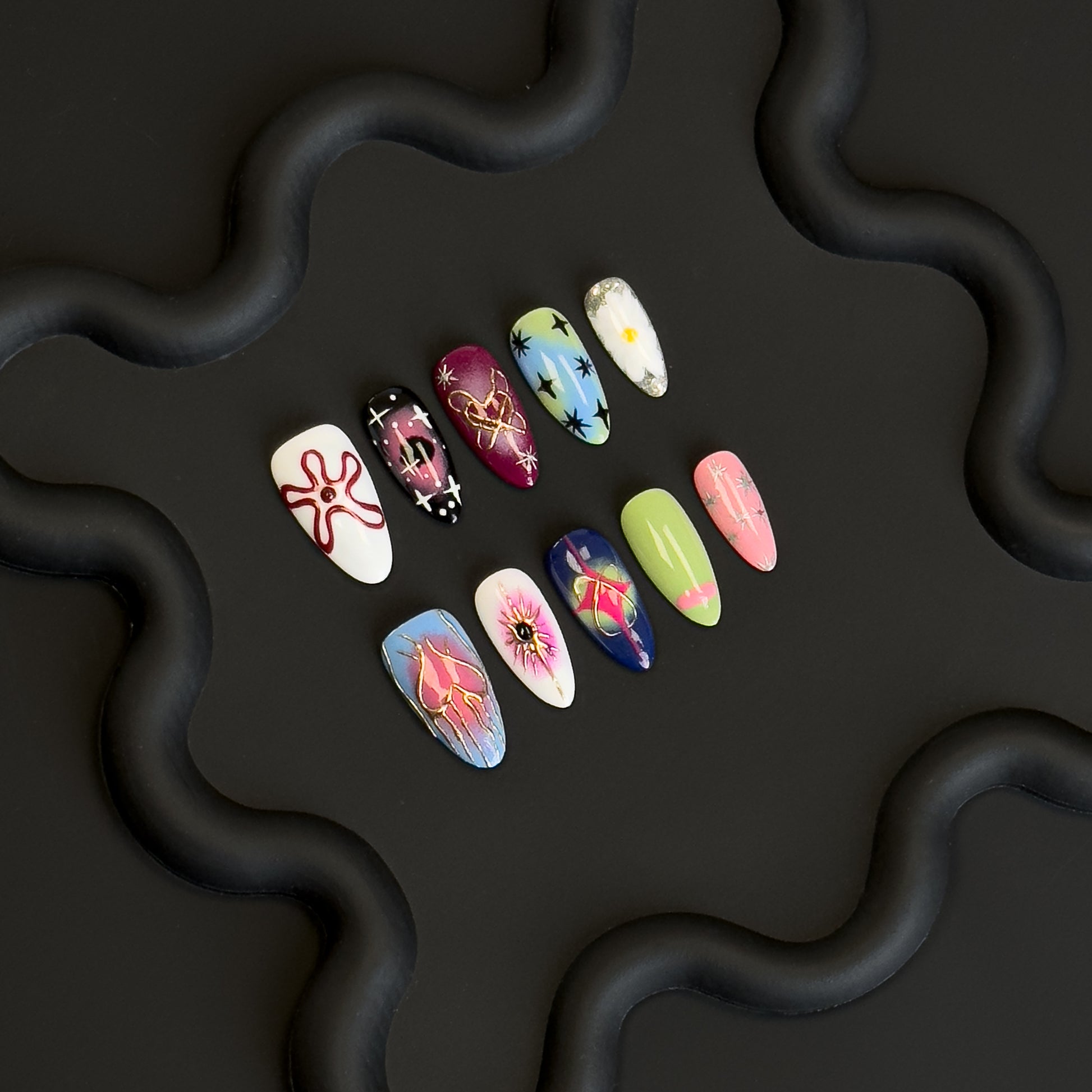 A vibrant mix of neon, pastel, and dark tones with bold stars, flames, hearts, and abstract lines. Each nail has its own playful design, full of retro Y2K and street-style energy. Perfect for anyone who loves bold colors, funky art, and creative freedom.