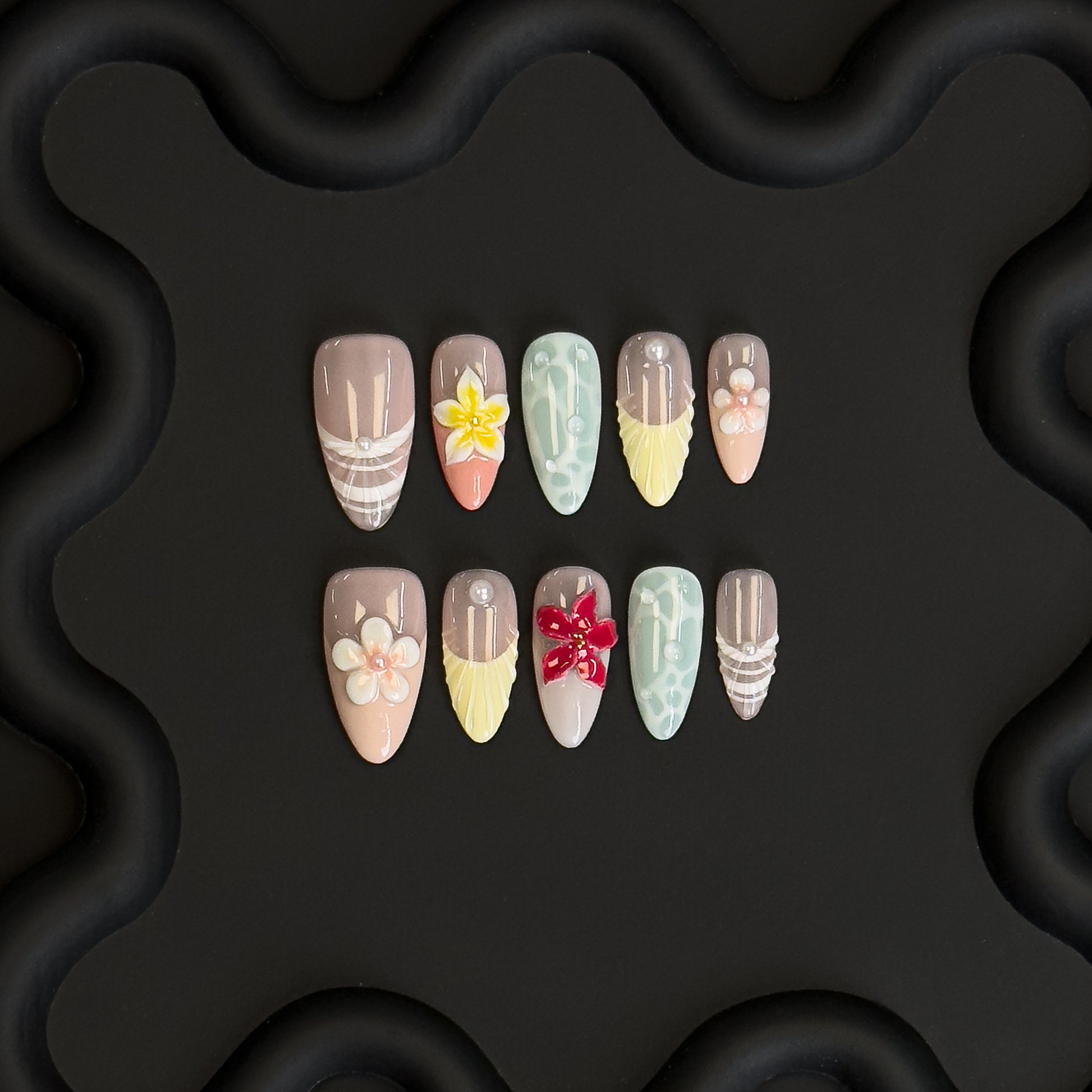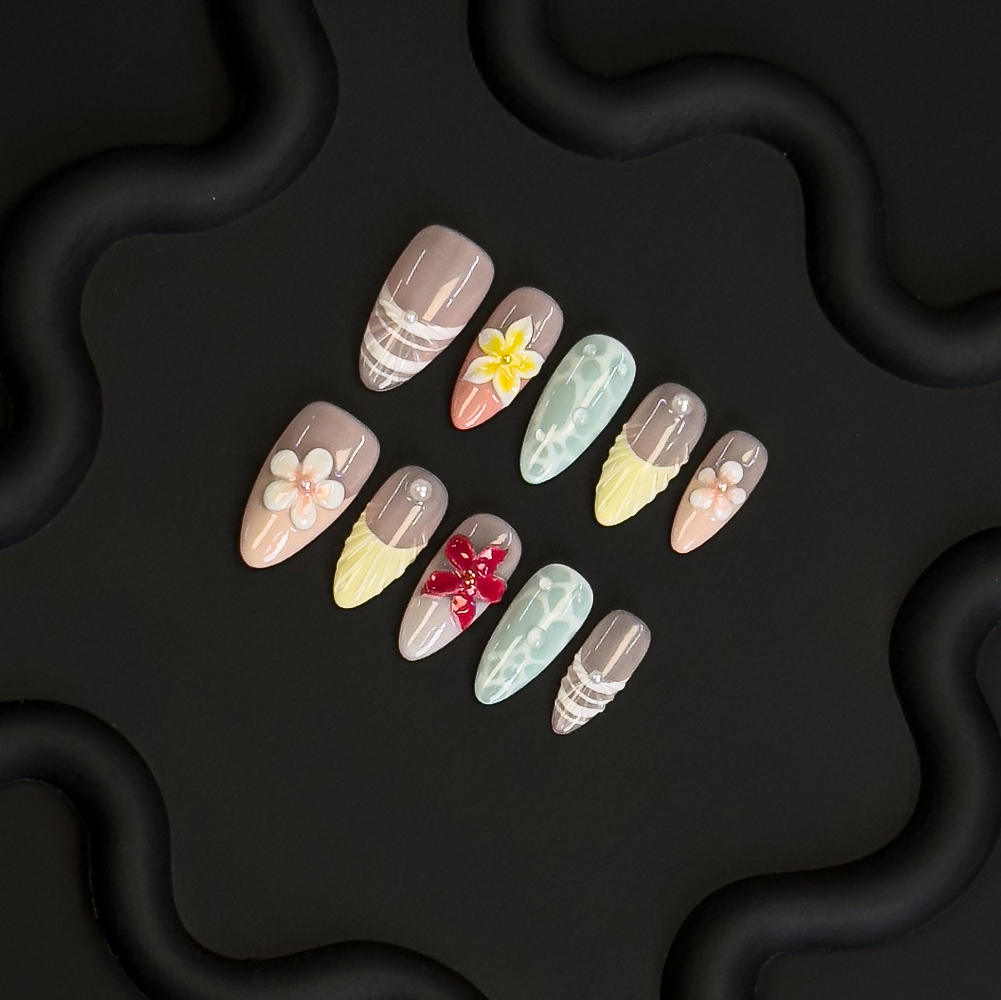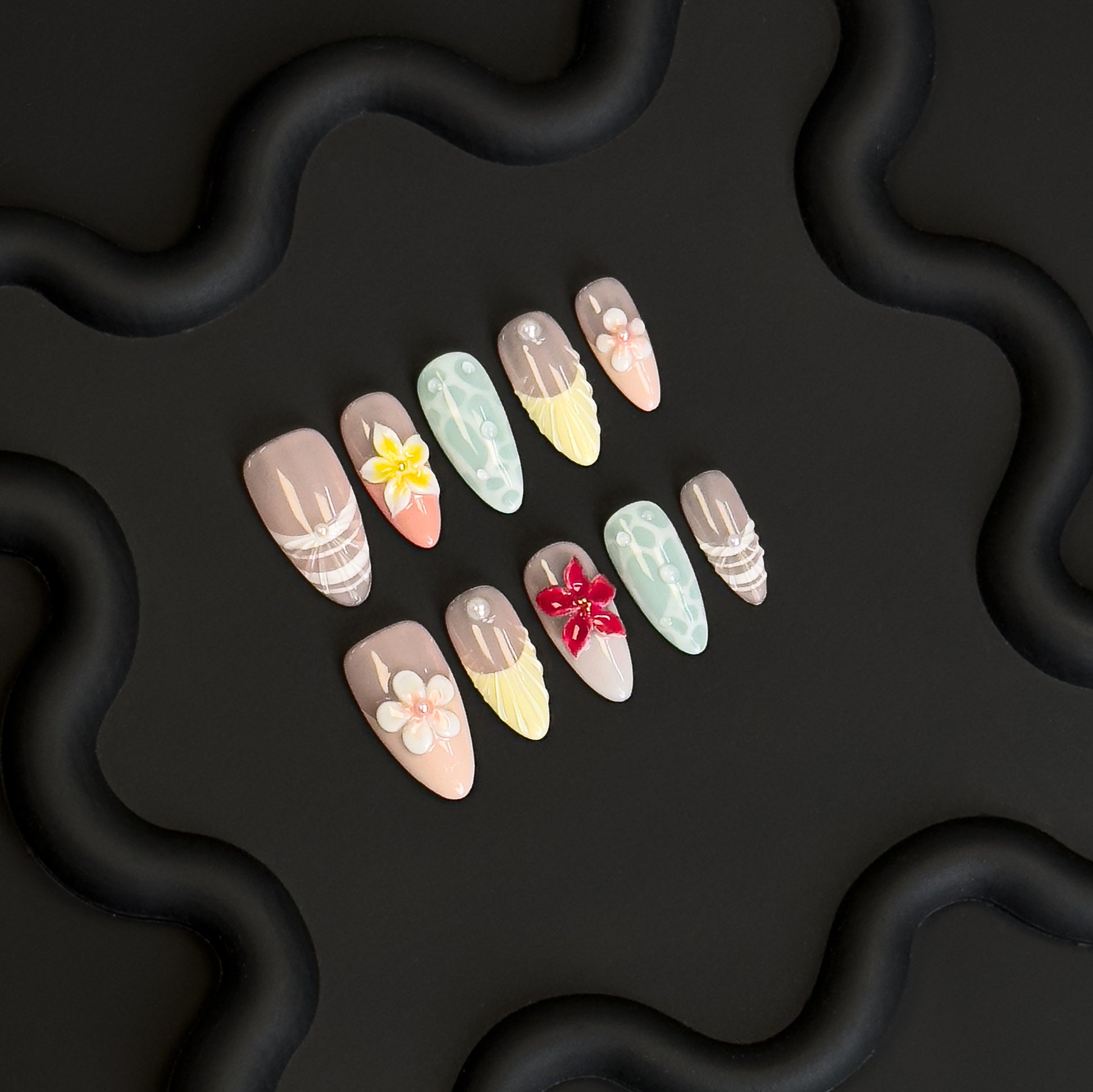 a soft blend of nudes, mint, and coral, accented with 3D florals, pearls, and delicate lines. Inspired by tropical elegance, this set brings a fresh and breezy charm to your fingertips.
