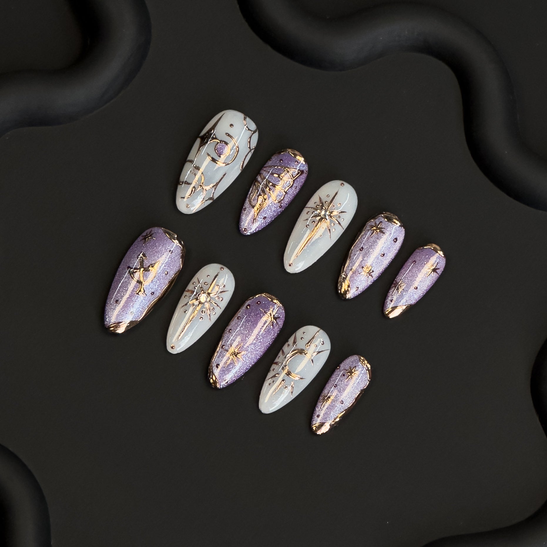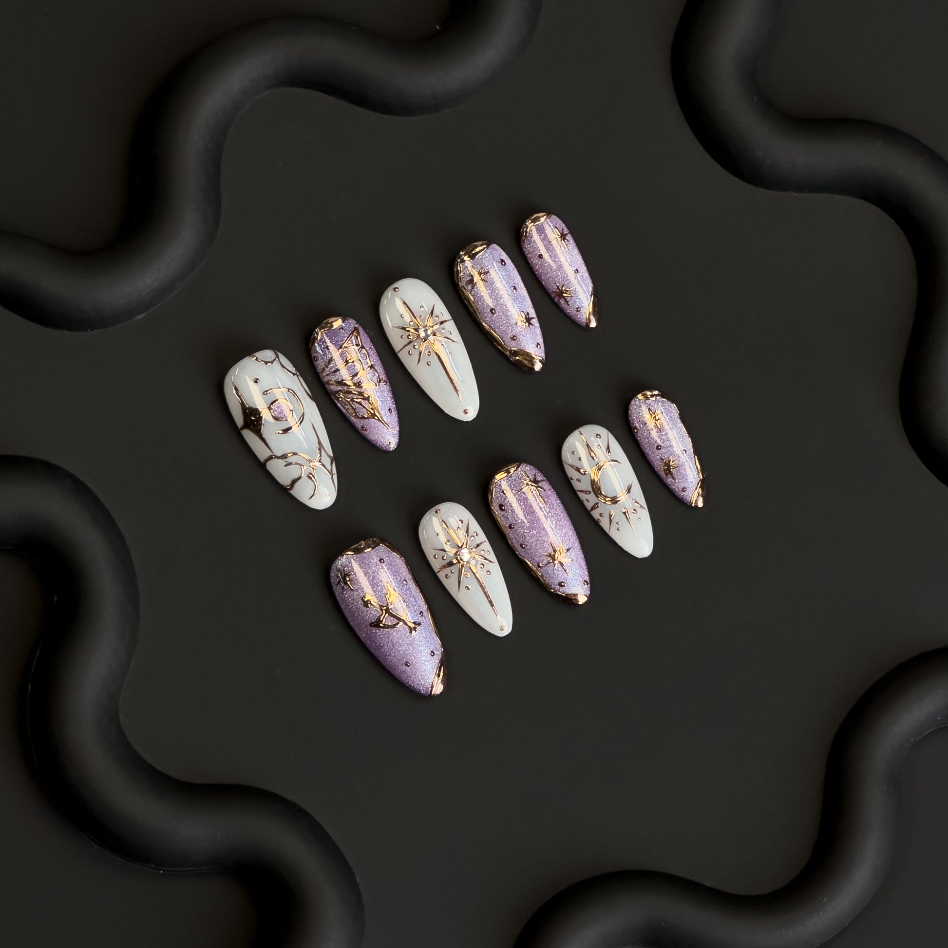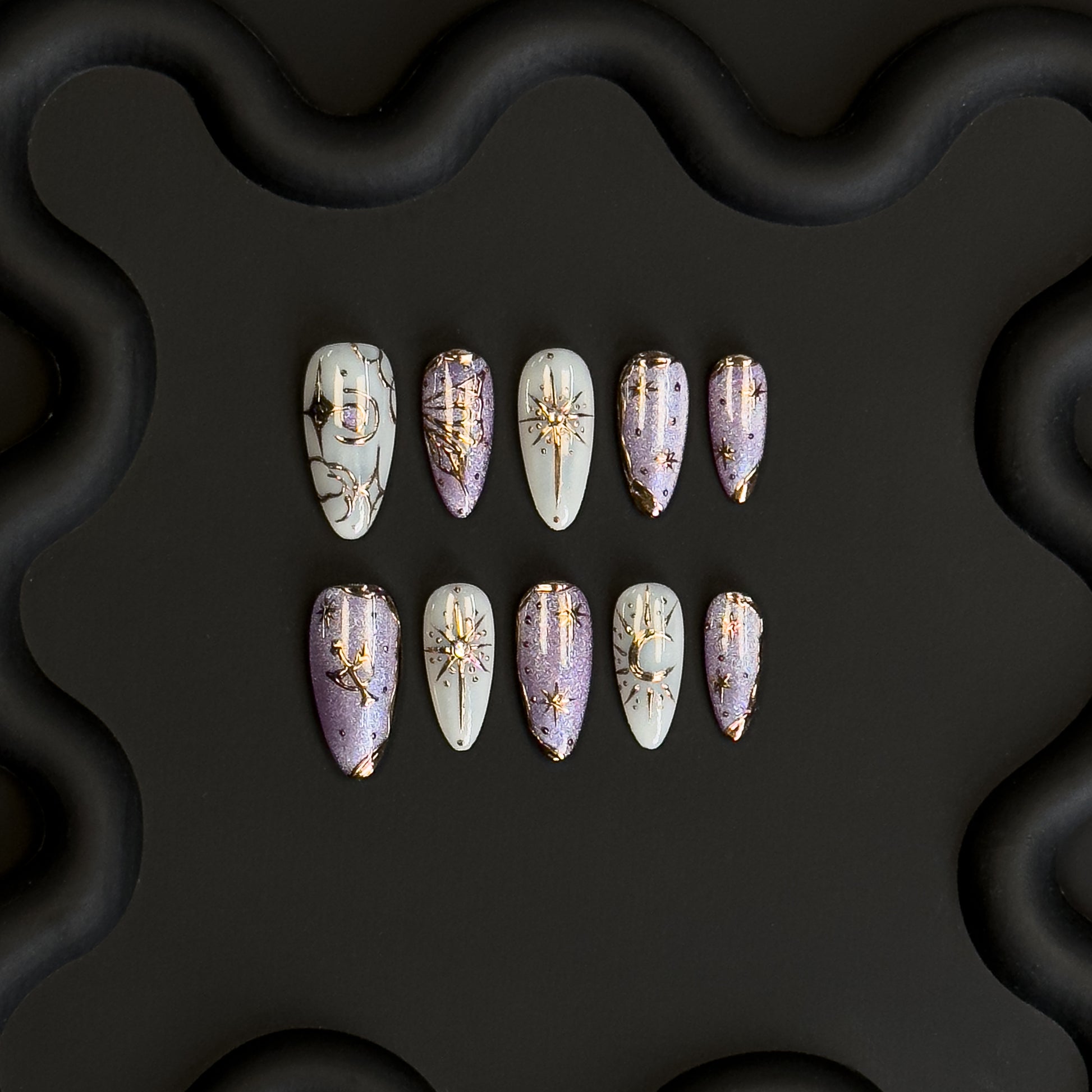 A dreamy mix of soft lavender and creamy white, decorated with golden stars, moons, and magical symbols. Glittery shine and fine gold lines bring a touch of cosmic mystery. Perfect for anyone who loves astrology, elegance, and a bit of sparkle.