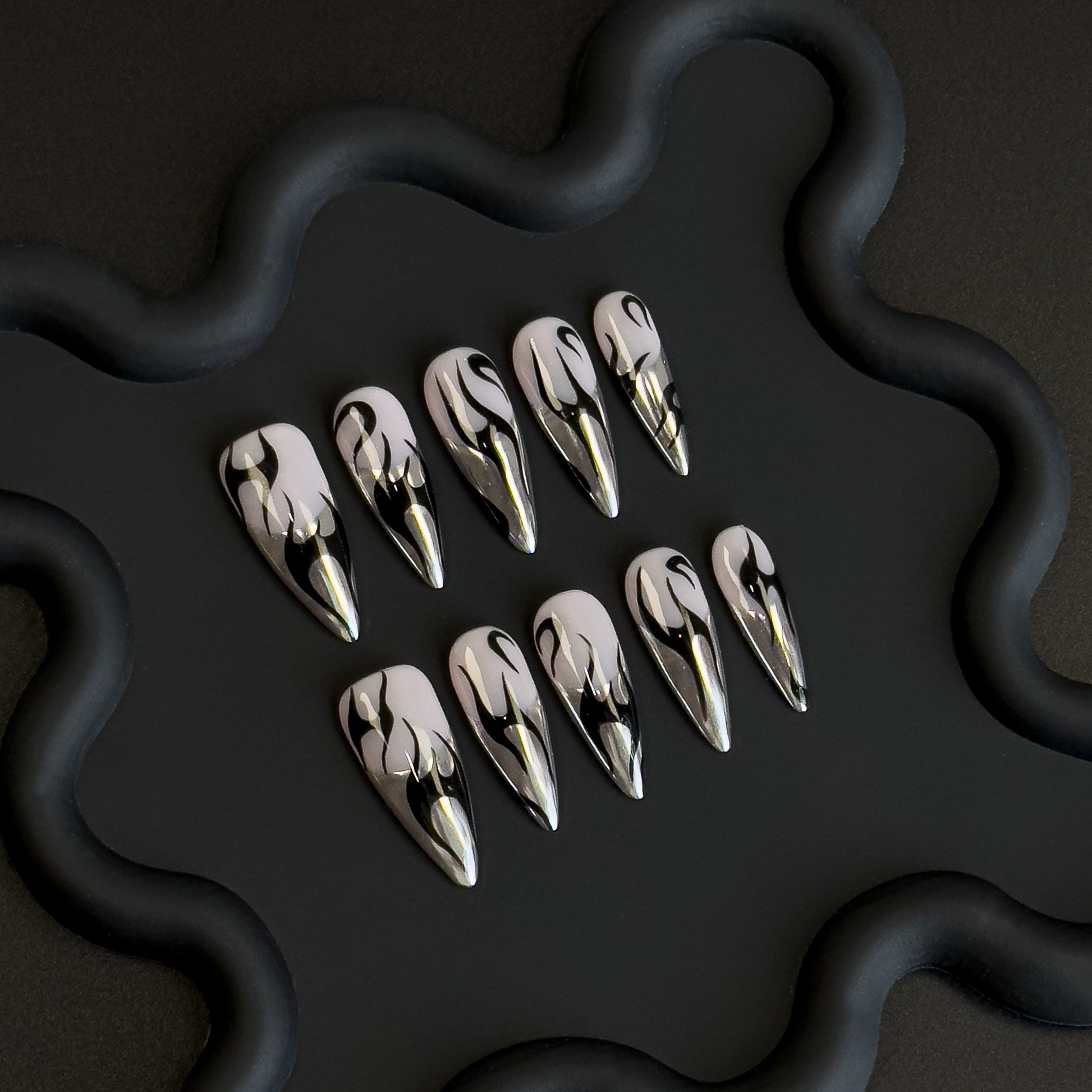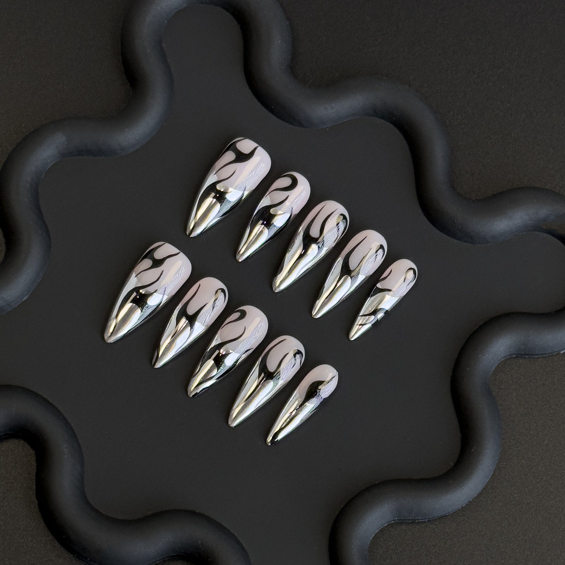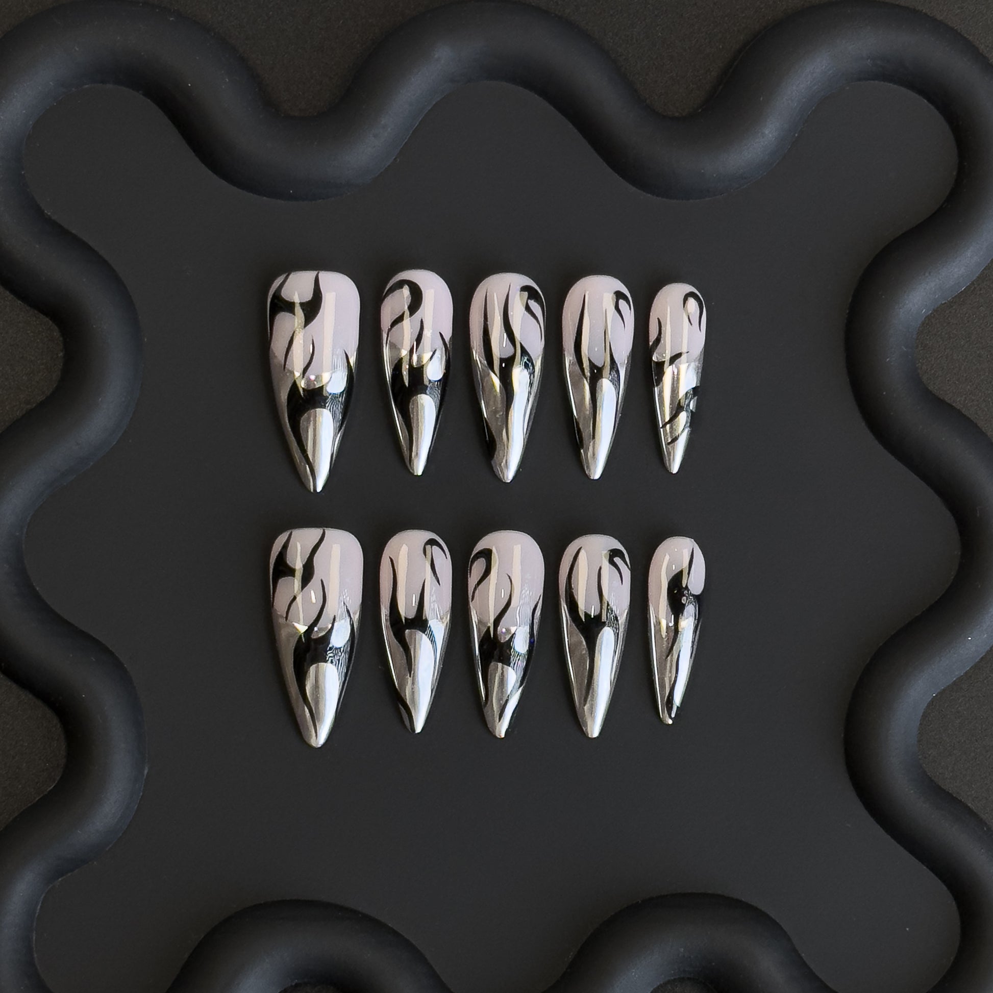 a fierce set featuring molten chrome flames rising from a nude-toned base. The ultra-reflective silver finish and sharp flame design create a powerful contrast of heat and coolness. Bold, edgy, and unapologetically futuristic, this set ignites your look with high-octane glam.