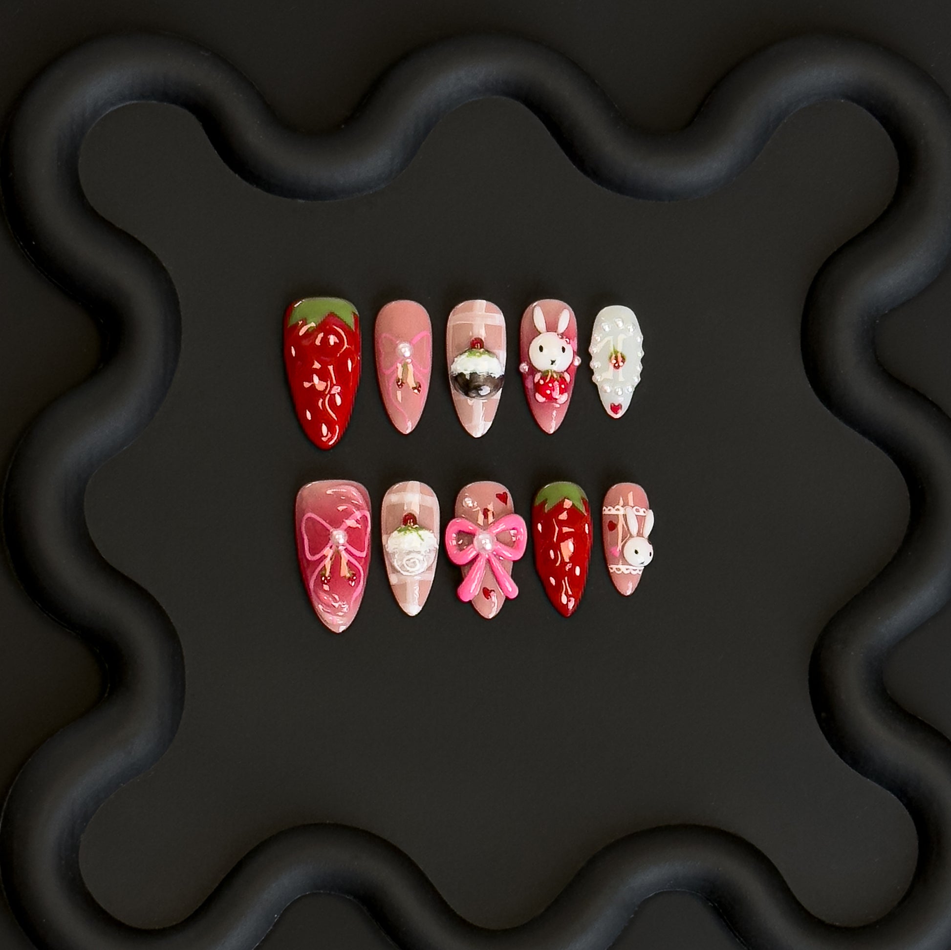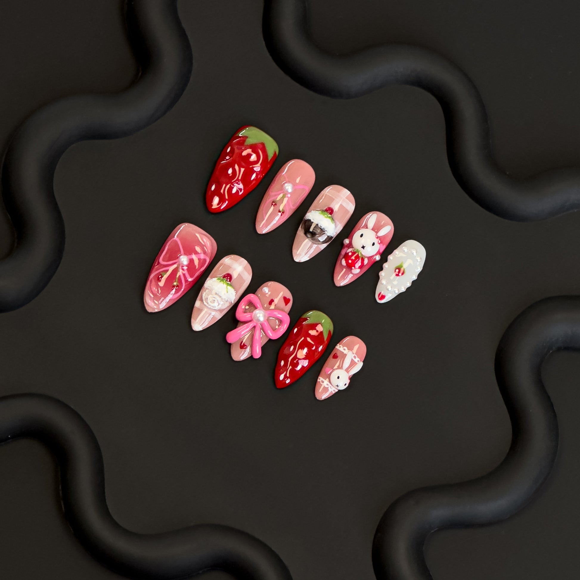 a playful mix of juicy strawberry reds and soft blush tones, adorned with 3D bows, roses, and kawaii bunny charms. Featuring glossy finishes, heart-shaped accents, and sweet treat textures, this set brings a dreamy, fairytale vibe to your fingertips. Perfect for lovers of cute, romantic styles with a whimsical twist.